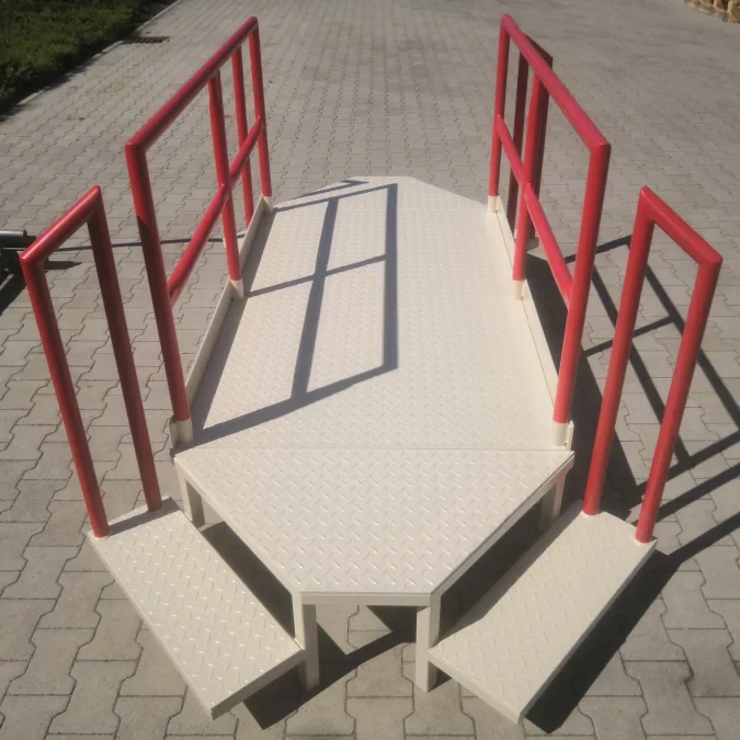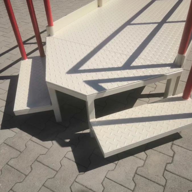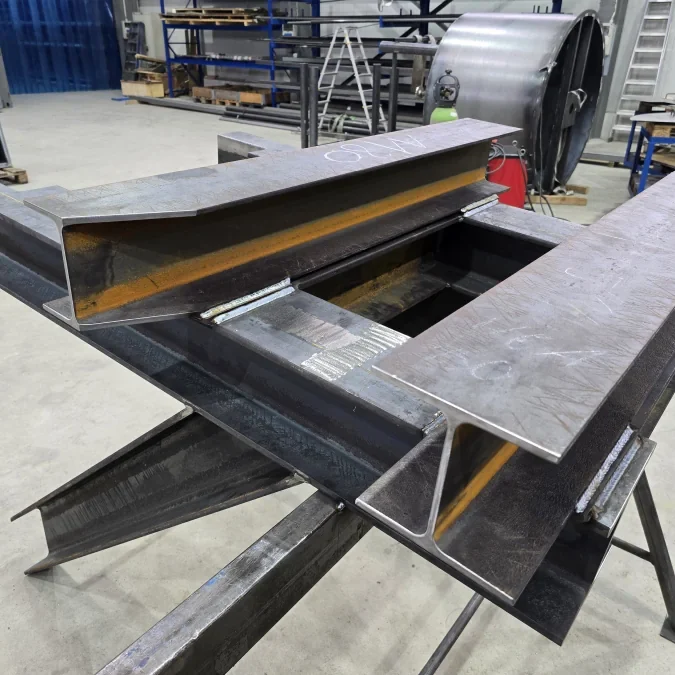 Die Stahlkonstruktion selber wird meist aus Hohlprofilen, Trägern oder auch Rundrohren in unserer Fertigung in Kleve am Niederrhein hergestellt. Geländer werden als Schraubverbindung, geschweisst, gequetscht oder mit dem Rohrverbinder-System der Firma Brinck verschraubt. Alle Kopfplatten, Fussplatten, Knotenbleche usw. werden auf Lasermaschinen gelasert oder sogar Wasserstrahl geschnitten, um ein Höchstmaß an Präzision gewährleisten zu können.