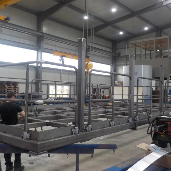 Wir fertigen für Sie Edelstahlkonstruktionen in 1.4301, 1.4571, 1.4841 oder auch in vielen weiteren Werkstoffen. Die Sonderwerkstoffe wie Inconel, Hastelloy und andere Werkstoffe, die bei der Härtereitechnik benötigt werden finden bei uns Verwendung. Die standardmäßige Herstellung der „Normalstahl“-Stahlkonstruktionen ist natürlich räumlich von der Edelstahlfertigung getrennt. Nur so können wir die bestmögliche Qualität gewährleisten. Die Fertigung ist ausschließlich „Made in Germany“ und wird durch unser QS-System nach DIN EN 3834 gewährleistet. Mehrere große 3D-Schweißtische gewährleisten ein Höchstmaß an Präzision und eine kostengünstige Fertigung, sodass schnelle Liefertermine eingehalten werden können. CNC-gesteuerte Abkantpressen, Schlagschere und diverse Biegemaschinen/Blechwalzen helfen uns bei der Fertigung. Speziellere Anforderungen decken wir durch die Fertigung bei unseren langjährigen Partnern. Sie als unser Kunde erhält das Gesamtprodukt natürlich von uns aus einer Hand.